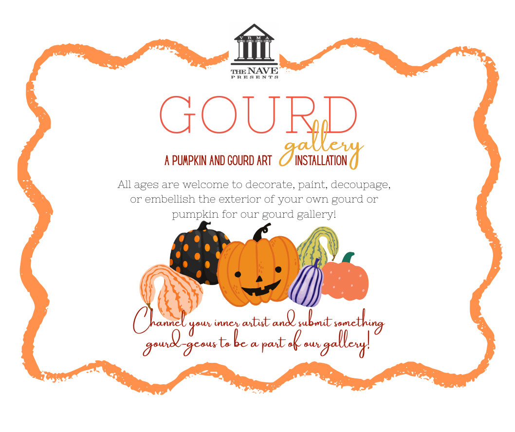 The Nave Museum will be hosting a fall-themed community gallery, featuring decorated pumpkins and gourds! All ages are welcome to decorate, paint, decoupage, or embellish the exterior of your own gourd or pumpkin for our gourd gallery!
